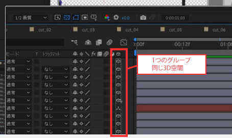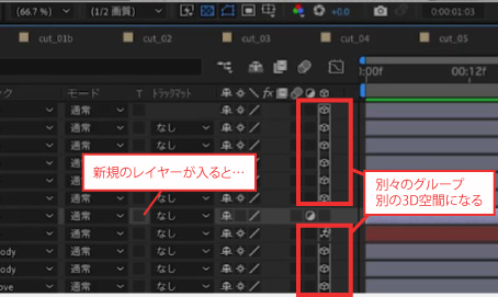 3ディービングのグループが解除されると別々の3D空間と認識される