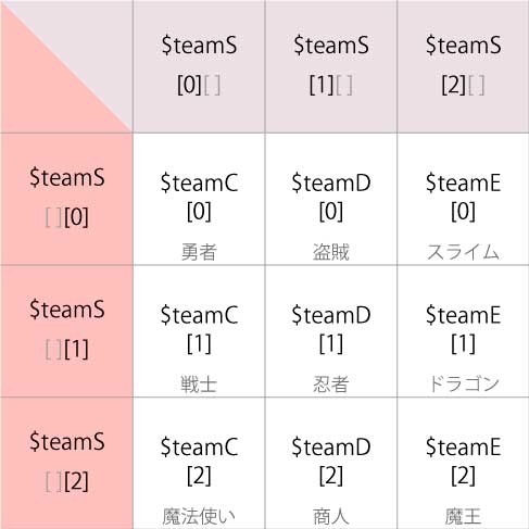 $teamS[0][0] = "狙撃手"; // $teamCの値が勇者→狙撃手に変更された